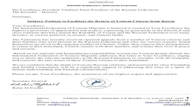 ناشد الاتحاد العالمي للمهاجرين اليمنيين الرئيس الروسي فلاديمير بوتين التدخل العاجل والسماح بعودة اليمنيين المتواجدين في جبهات القتال داخل الأراضي الروسية، بعد انتهاء عقودهم المؤقتة وعدم السماح لهم بالمغادرة، وسط ضغوط تُمارس عليهم للاستمرار.
