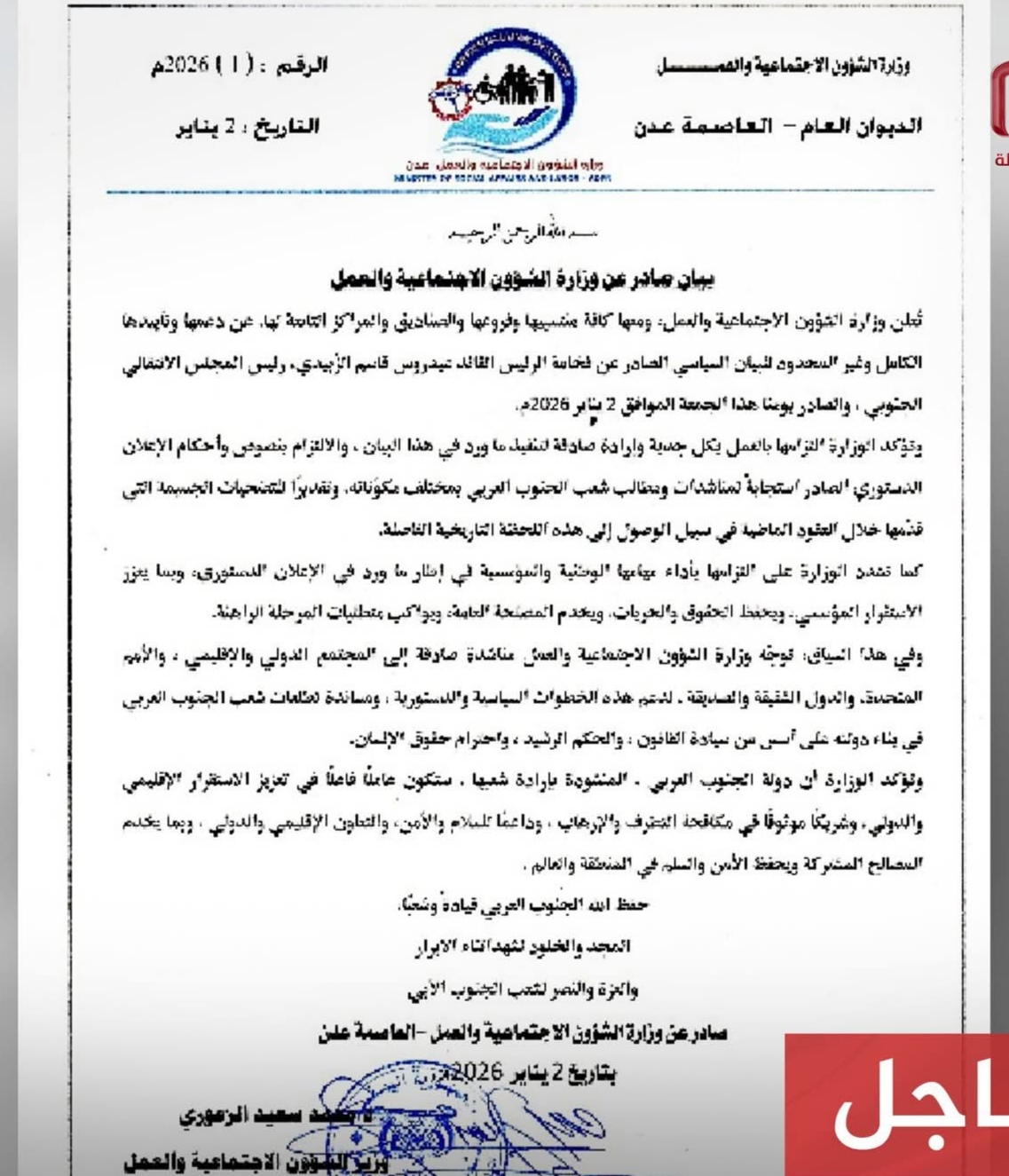 أعلنت وزارة الشؤون الاجتماعية والعمل دعمها الكامل وغير المحدود للبيان السياسي الصادر عن فخامة الرئيس القائد عيدروس قاسم الزُبيدي، رئيس المجلس الانتقالي الجنوبي والقائد الأعلى للقوات المسلحة الجنوبية، مؤكدة أن ما ورد فيه يعبر عن تطلعات شعب الجنوب في الحرية والاستقلال وبناء دولته المستقلة. وقالت الوزارة، في بيان صادر عنها اليوم، إنها تتابع باهتمام بالغ التطورات السياسية والعسكرية والأمنية التي تشهدها البلاد، محذرة من خطورة التصعيد الذي يهدد أمن واستقرار الجنوب. وشددت الوزارة على ضرورة توحيد الصف الجنوبي وتعزيز التلاحم الوطني لمواجهة التحديات الراهنة، والتصدي للمؤامرات التي تستهدف جر الجنوب إلى مربع الفوضى والصراعات، مؤكدة أهمية الالتفاف حول القيادة السياسية ودعم القرارات المتخذة لحماية مكتسبات شعب الجنوب. ودعت وزارة الشؤون الاجتماعية والعمل المجتمع الدولي والإقليمي والمنظمات الحقوقية والإنسانية إلى تحمل مسؤولياتهم تجاه ما يتعرض له الجنوب، واتخاذ مواقف واضحة لحماية المدنيين واحترام حقوق الإنسان وسيادة القانون. واختتمت الوزارة بيانها بالتأكيد على أن مشروع دولة الجنوب العربي المستقلة يمثل مشروعًا وطنيًا جامعًا، يستند إلى الإرادة الشعبية، ويهدف إلى تحقيق الأمن والاستقرار في المنطقة، ودعم الأمن الإقليمي والدولي وحماية الملاحة الدولية.