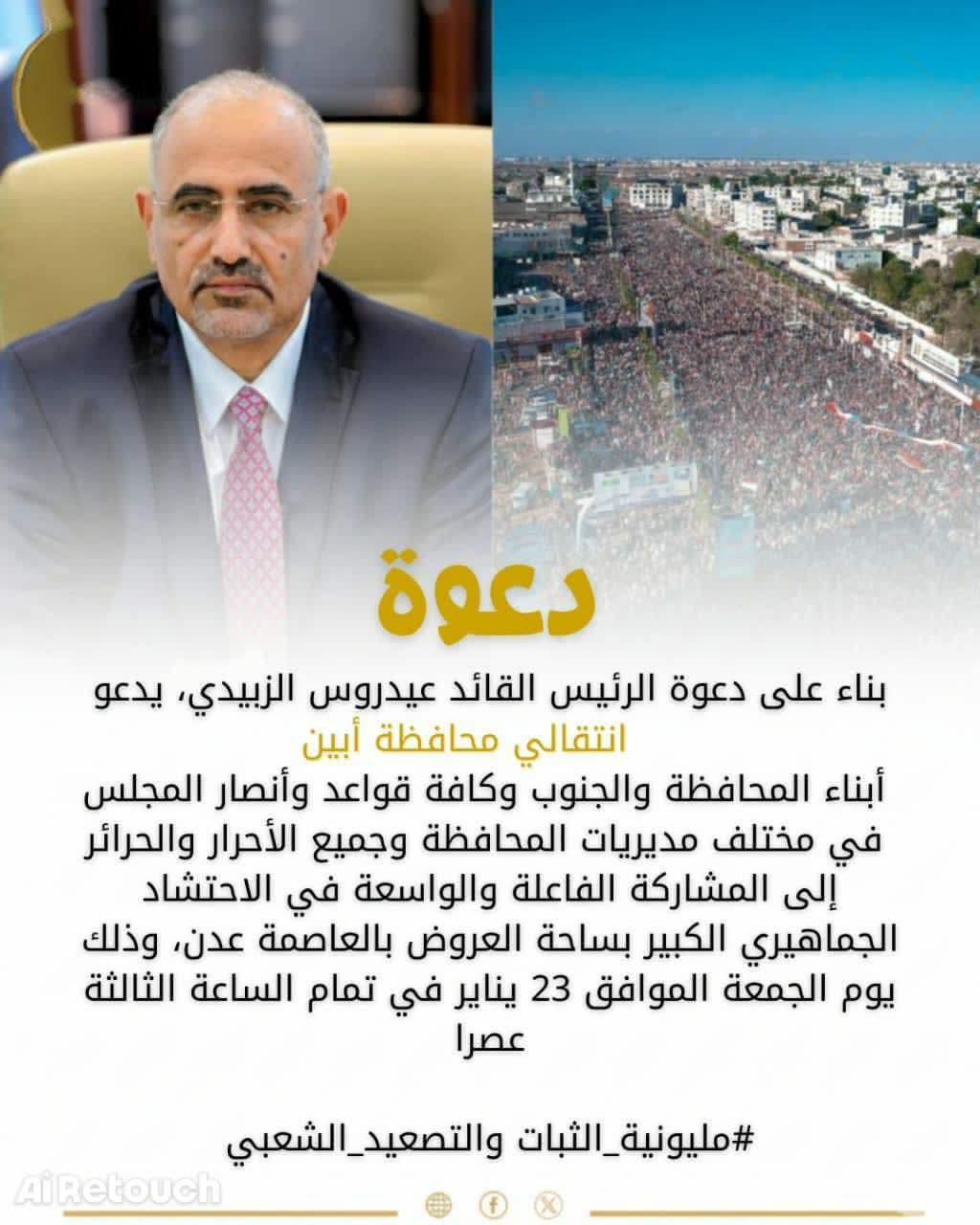 دعت القيادة المحلية للمجلس الانتقالي الجنوبي بمحافظة أبين جماهير المحافظة كافة إلى الاحتشاد الجماهيري الواسع، عصر يوم غد الجمعة الموافق 23 يناير 2026م، في ساحة الحرية (العروض) بمديرية خور مكسر في العاصمة عدن، استجابة للدعوة التي أطلقها الرئيس القائد عيدروس قاسم الزُبيدي، رئيس المجلس الانتقالي الجنوبي، القائد الأعلى للقوات المسلحة الجنوبية.