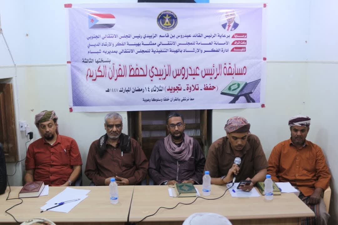 أقام قسم الفكر والإرشاد بالهيئة التنفيذية للقيادة المحلية للمجلس الانتقالي الجنوبي بمديرية شبام محافظة حضرموت، مساء الثلاثاء 14 رمضان 1447هـ، مسابقة الرئيس الزُبيدي لحفظ القرآن الكريم تحت شعار ” معًا نرتقي بالقرآن خُلُقًا وسلوكًا وهوية”، بمشاركة 7 متسابقين من مختلف مناطق المديرية.