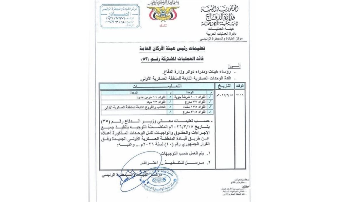 كشفت وثيقة مسربة جرى تداولها واسعاً عن صدور أوامر عسكرية من المدعو “طاهر العقيلي”، تقضي بإعادة القوات والقادة الشماليين التابعين للمنطقة العسكرية الأولى إلى مواقعهم في وادي وصحراء حضرموت. ووفقاً للوثيقة، فإن هذه الأوامر الصادرة بتعليمات سعودية، تقضي بعودة وحدات “الاحتلال اليمني” – بما فيها الشرطة الجوية، والألوية 37 و315 مدرع، و135 مشاة – إلى الميدان، بعد أن كانت القوات المسلحة الجنوبية قد طهرت الوادي منها ضمن عملية “المستقبل الواعد” أواخر العام المنصرم. واعتبر ناشطون ومراقبون جنوبيون أن هذه الخطوة تهدف إلى إعادة تمكين القوات الموالية لجماعة الإخوان في مناطق الجنوب الاستراتيجية، والالتفاف على المكتسبات الأمنية والعسكرية التي حققتها القوات الجنوبية في تأمين وادي حضرموت من الإرهاب والاحتلال.